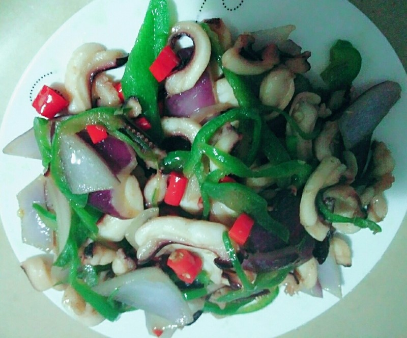 7:将炒勺刷开净放油加洋葱青红椒翻炒断生放入炒好的章鱼足片加盐生抽蚝油翻炒均匀加点鸡精油明油出勺