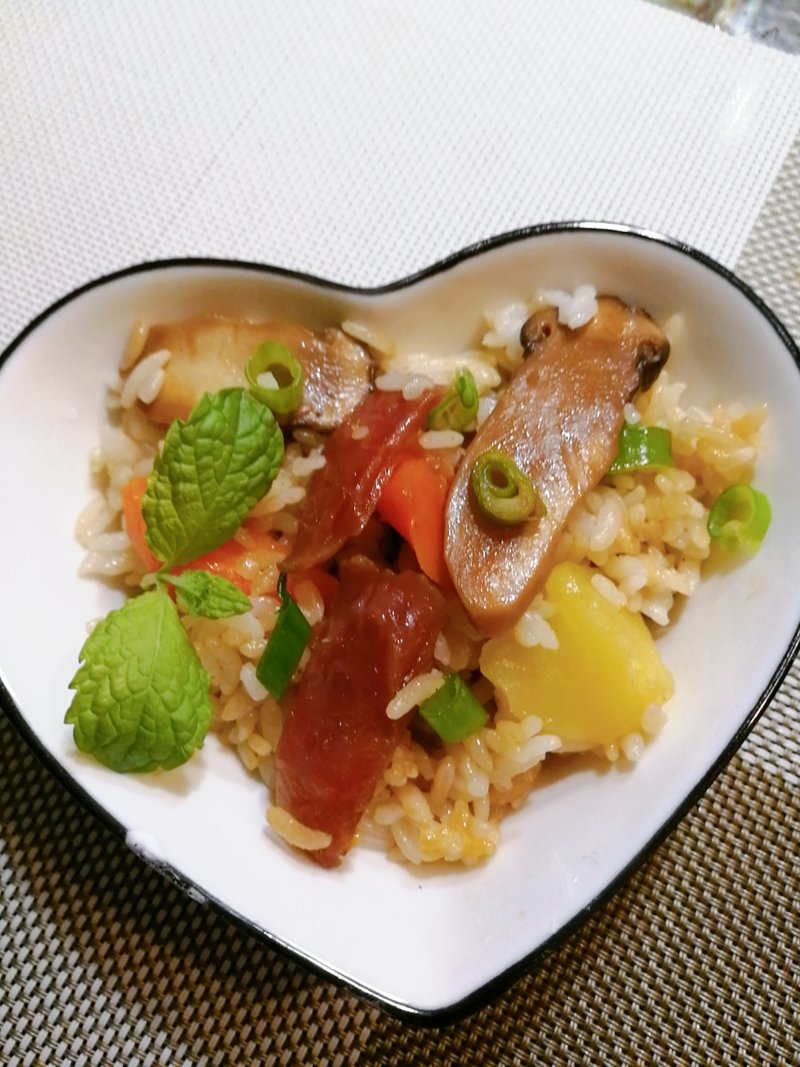 7:煮饭至八分熟,在米饭上摆上腊肠片。