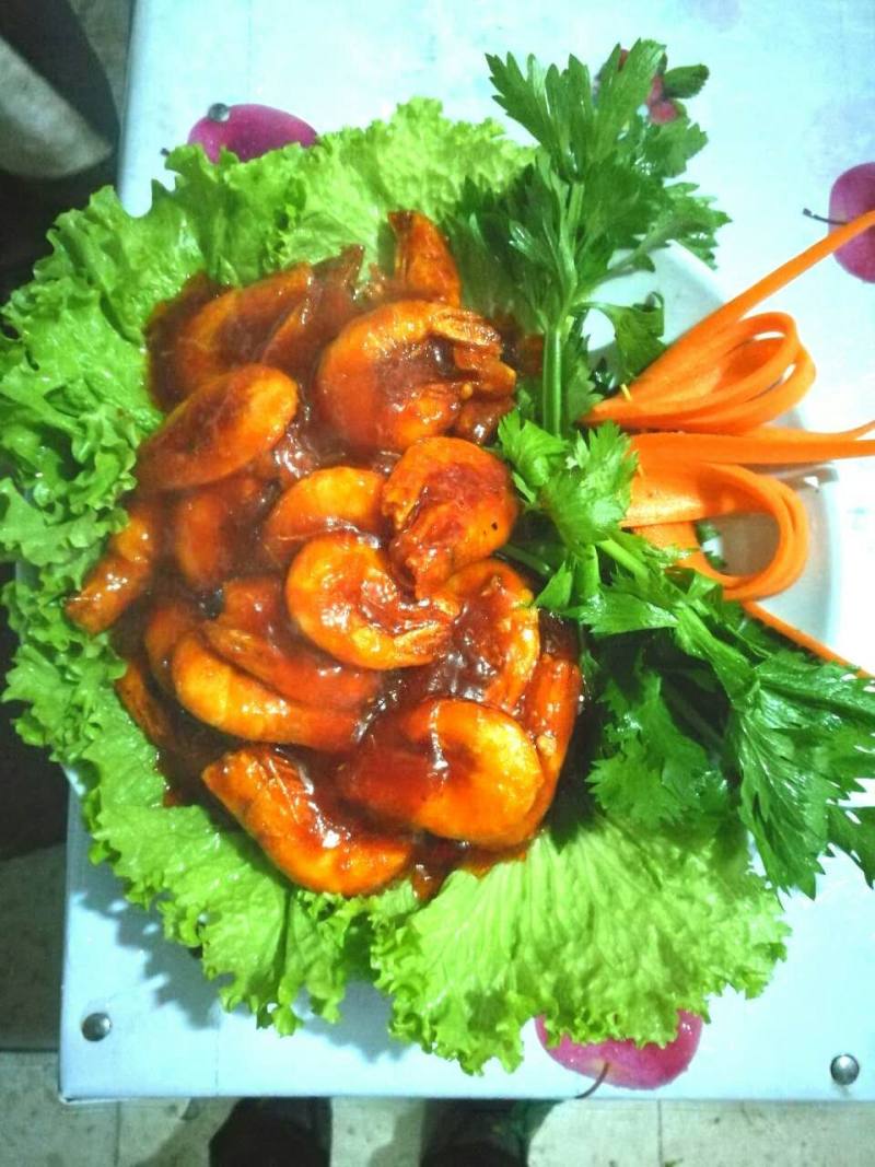 4:锅中放油烧至7成热,将虾下锅炸熟捞出,锅内放置少许油将调好的番茄汁炒制,再将虾倒入锅内翻炒,改小火焖至2一3分钟即可出锅码盘