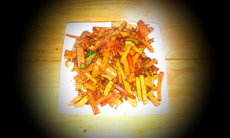 11:放入之前炒好的胡萝卜丝和青椒丝。