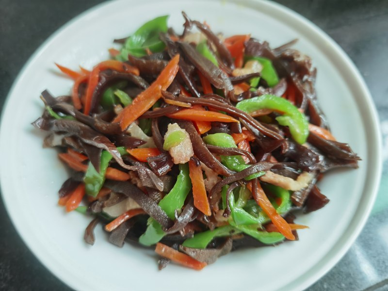 毛木耳两朵;胡萝卜半根;青椒两个;五花肉少许;