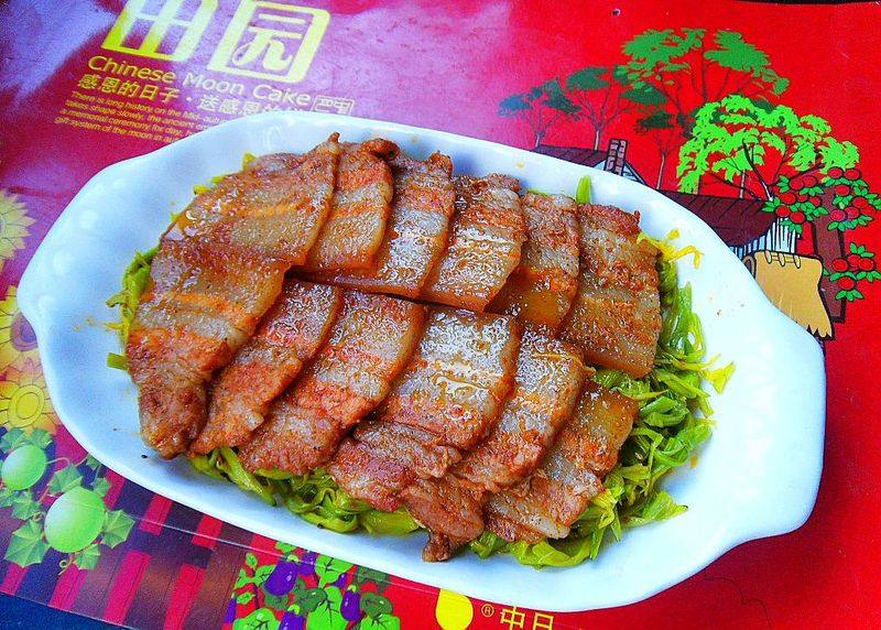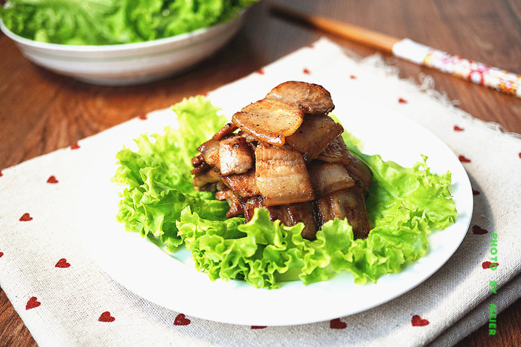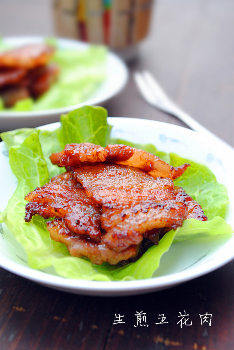5:5、煎至五花肉的边微微卷起,一边煎肉一边刷蜂蜜,肥肉里的油份煎出来为止。煎至好的五花肉可以卷生菜吃也可以卷饼吃。