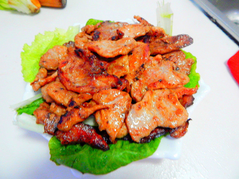 7:出锅,撒上烧烤蘸料。油留在锅里炒青菜。
