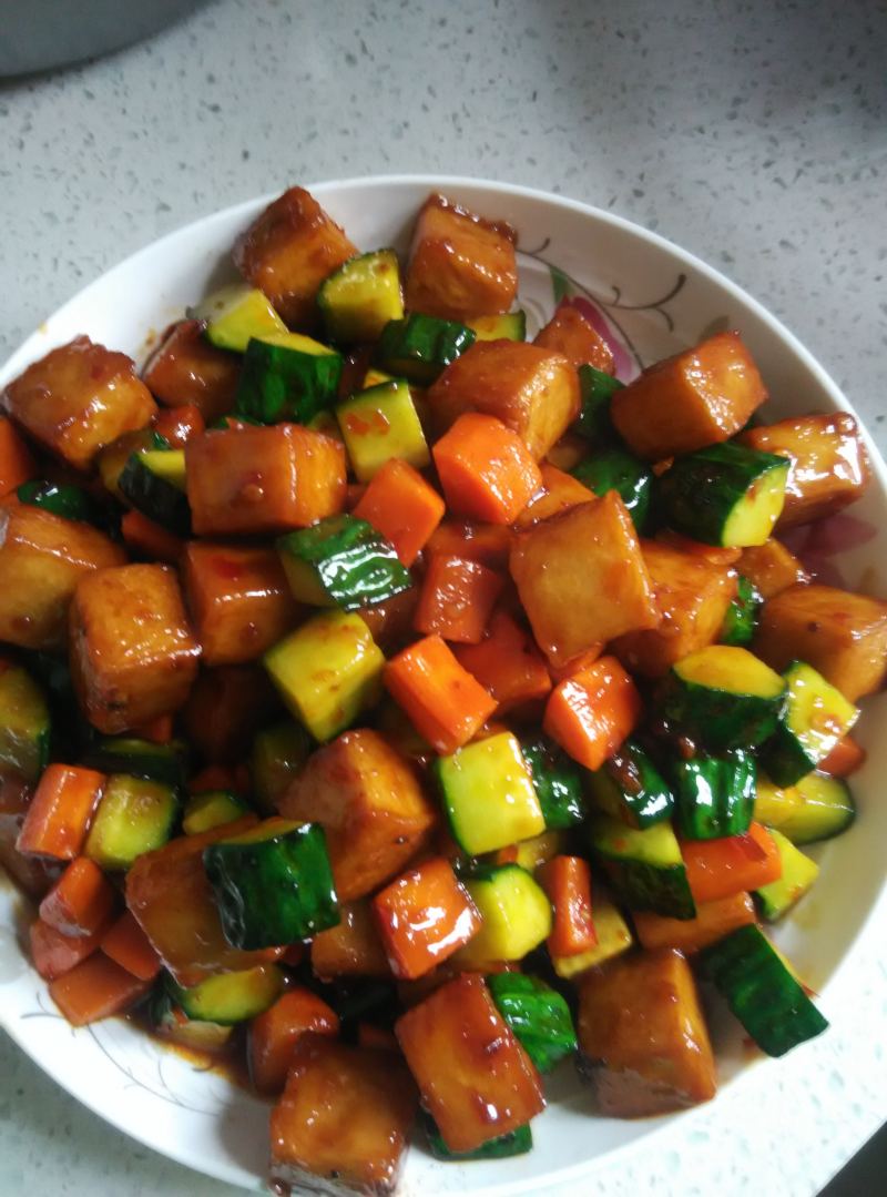 4:锅中到油,油热了放胡萝卜,鱼豆腐,把胡萝卜炒的差不多放烧烤酱,盐,水,我不爱吃辣的又放了点糖,搅匀后放黄瓜炒匀