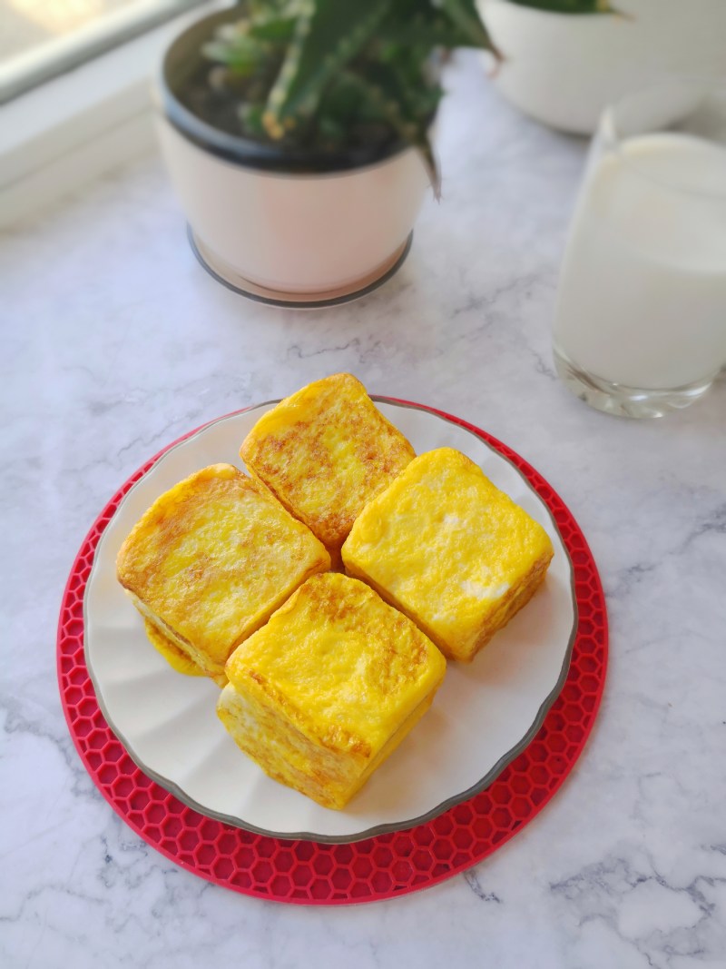 5:放入沾满鸡蛋液的面包片,中小火煎至两面金黄即可。
