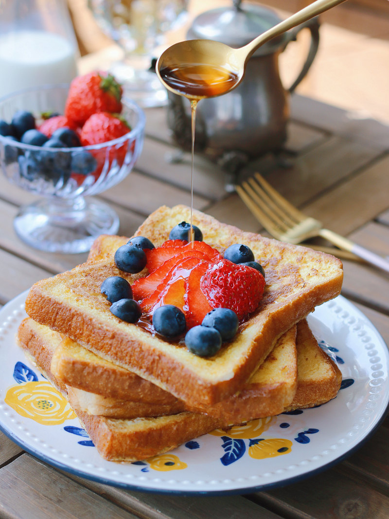 9:撒上洗净的水果,浇上冰糖糖浆就可以啦。甘汁园的这款冰糖糖浆清甜可口,甜度适中,不会甜到齁,搭配西多士吃正好。