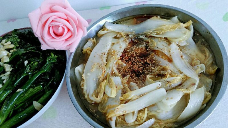 3:娃娃菜帮和叶分开,菜帮斜片成片,如果是白菜竖切两半再片片儿,叶切大块儿。