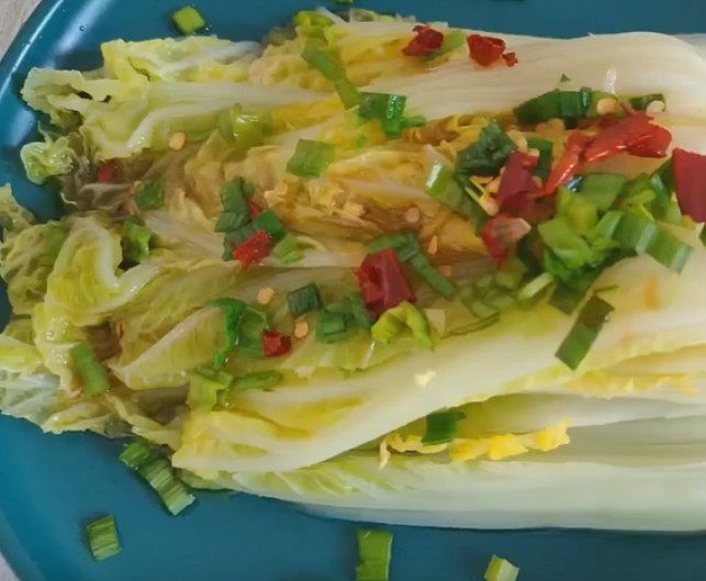 7:轻轻翻动,让娃娃菜均匀入味。加入辣椒,出锅之前再撒上葱末。装盘,撒上香菜点缀。
