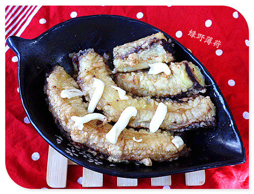 7:炸好的香蕉挤上丘比沙拉酱即可。