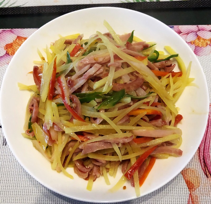 4:鲜香的红肠土豆丝出锅。