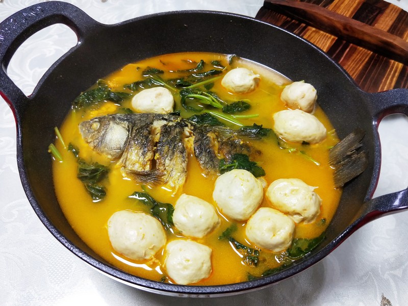 4:把鲫鱼、肉丸子、姜片,倒入另一个已烧开水的锅内。