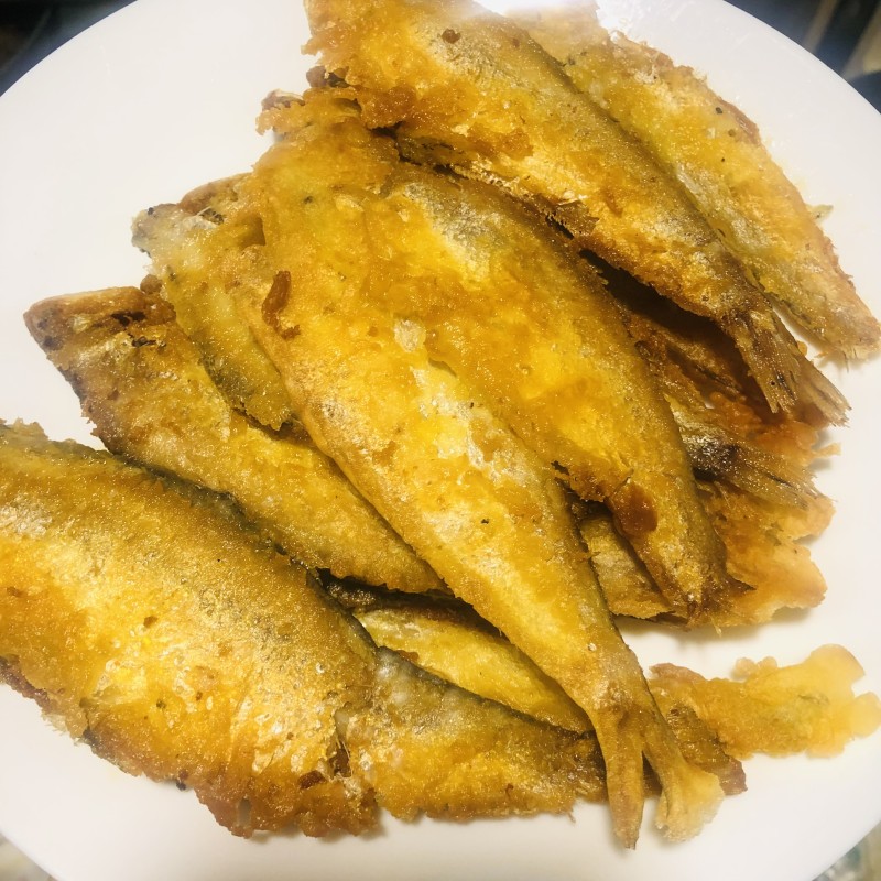 5:煎锅中倒油,油热放入黄鲫子鱼炸至两面金黄。