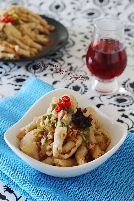 1.如果喜欢吃更劲道的,小火煮20分钟就可以了。冰水浸泡不可少。怪兽爸爱吃软的,所以我煮得时间久些,去骨也容易些。2.去骨的时候不需要把所有的骨都去掉。去掉大部分就可以了。我一般将靠近爪子的那段骨头都留着,这样爪子不容易散,卖相才会好,口感也不打折。3.去骨后的鸡爪在腌料中泡得时间越长,越入味。我会一次多做些,当天吃劲道的。剩下的放冰箱,第二天放微波炉里叮几分钟,软而入味,味道很完美(见成品图2)。