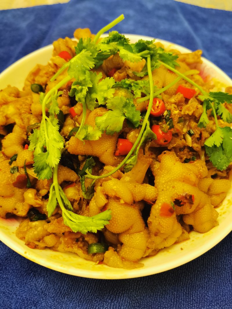 5:拌好的鸡爪上面撒上一点点香菜就可以开吃了。