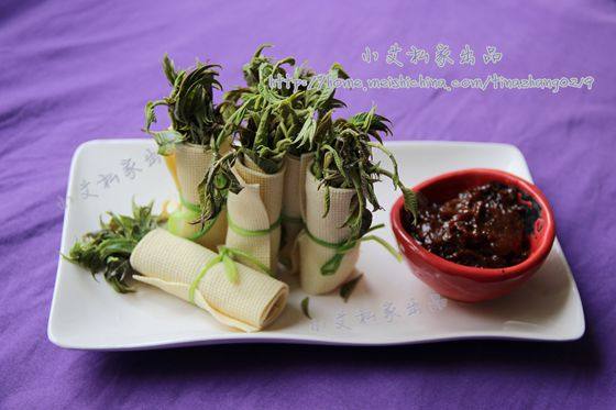 7:用香菜把豆卷系上,防止散开。依次把所有的豆皮卷都做好。