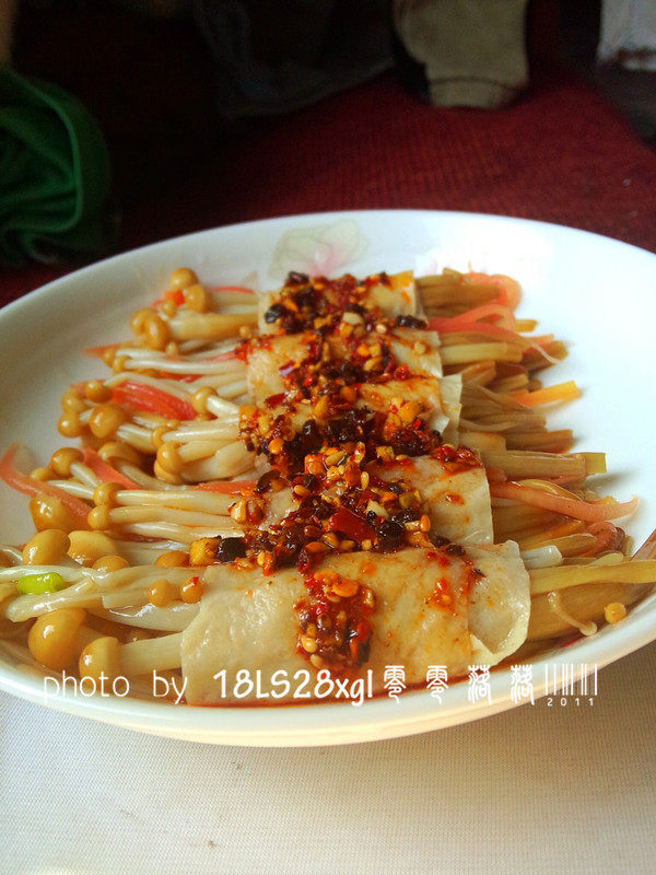 8:将金针菇、胡萝卜丝放在豆腐皮上面,如图;