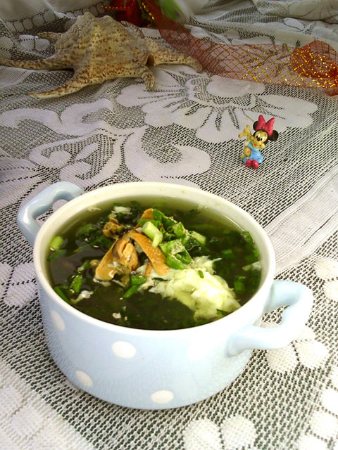淡菜需泡发后才易于去除泥肠。茼蒿菜不宜久煮,烫熟即可,以免失去清香味。蛋清熟透即熄火,可保持滑嫩口感。