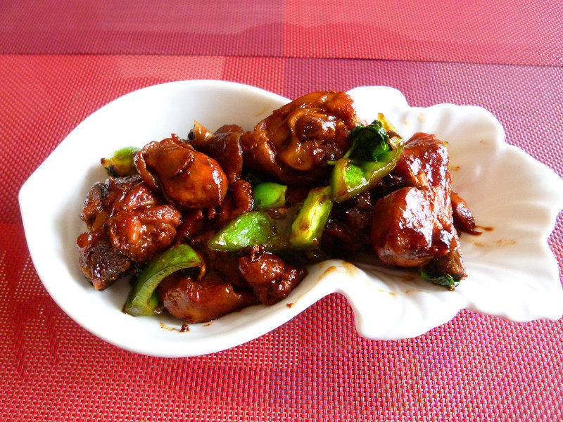 最初的干煸一定要掌握好火候,煸至鸡肉有些缩小,表面金黄后,再进行下步。