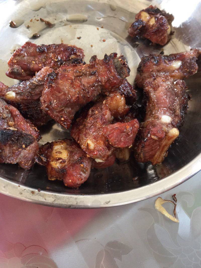 3:开始烤啦,烤肉第一是调肉味,第二就是烤的火候,烤排骨不能用大火,小火翻烤,烤将近半个小时,撒上孜然粉就好啦!