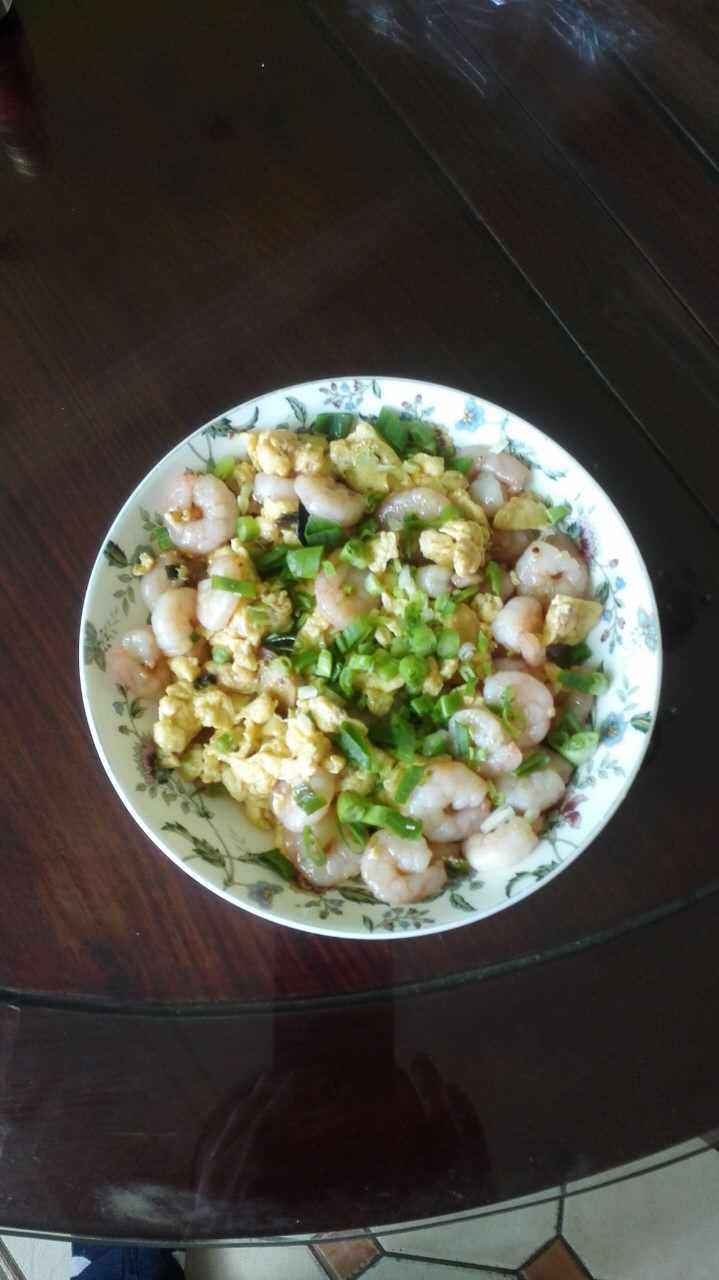 4:虾仁很嫩,非常容易熟,等颜色变化和卷曲,放入鸡蛋、盐、味精、滴几滴料酒翻炒,出锅前撒入葱花装盘。