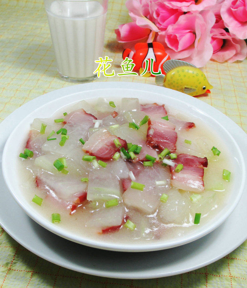 1:食材:冬瓜(已去皮去籽清洗切片)、腊肉(已切片)、香葱、水淀粉