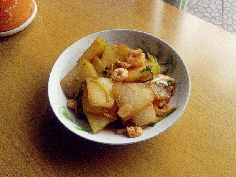 4:油至6成热放入猪肉,炒至去水出油,加入虾仁,葱姜、酱,爆香,倒入切好的冬瓜,倒入少放水,加入盐,(鸡精适量,建议不用),烧至冬瓜入味,注意别水量。