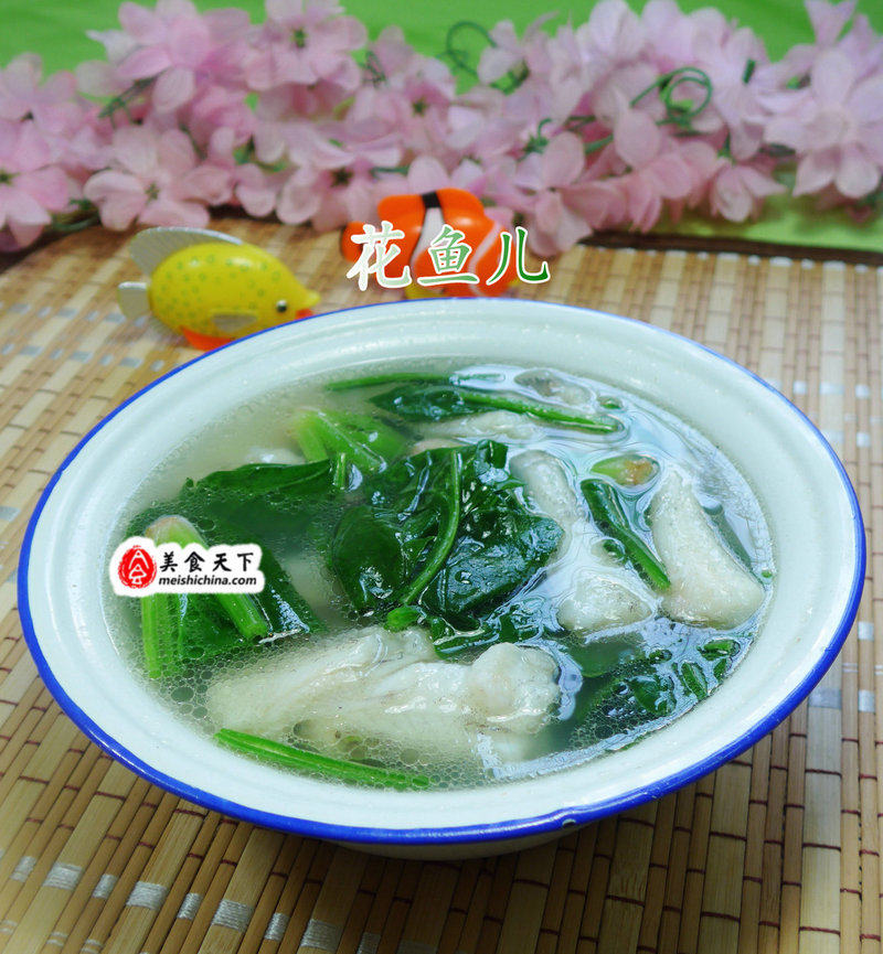 1:食材:虾潺(已洗净剪开)、菠菜(已洗净切开)
