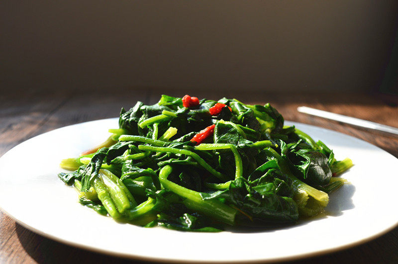 水东芥菜的爽脆是其最大的特色,因此需要火大猛炒但时间要短;猪油是青菜最好的搭配,动物的油脂能把蔬菜的青涩降至最低,引出其清爽的味道。