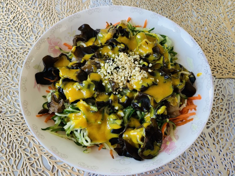 1:准备好食材:木耳泡发后用水焯熟;黄瓜丝用盐腌一下出些水分。