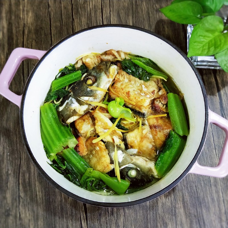 5:将鱼头铲入芥菜表面,开火炖8分钟。