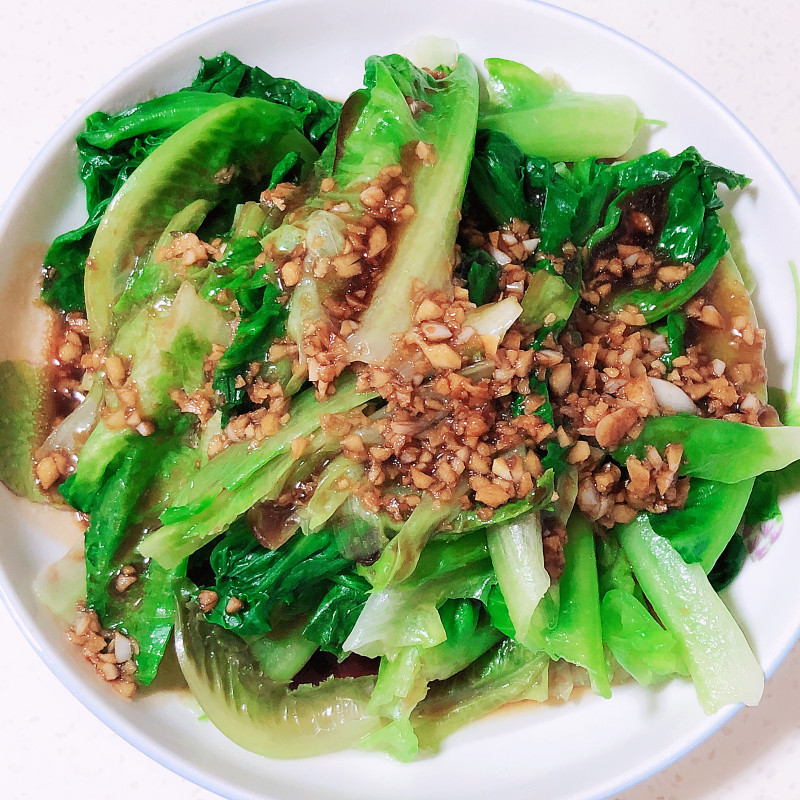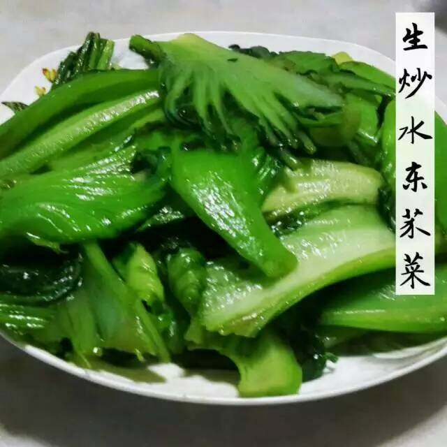 2:猪油下锅,放入蒜头爆香,趁大火加入水东芥菜,快速翻炒,下盐出锅;
