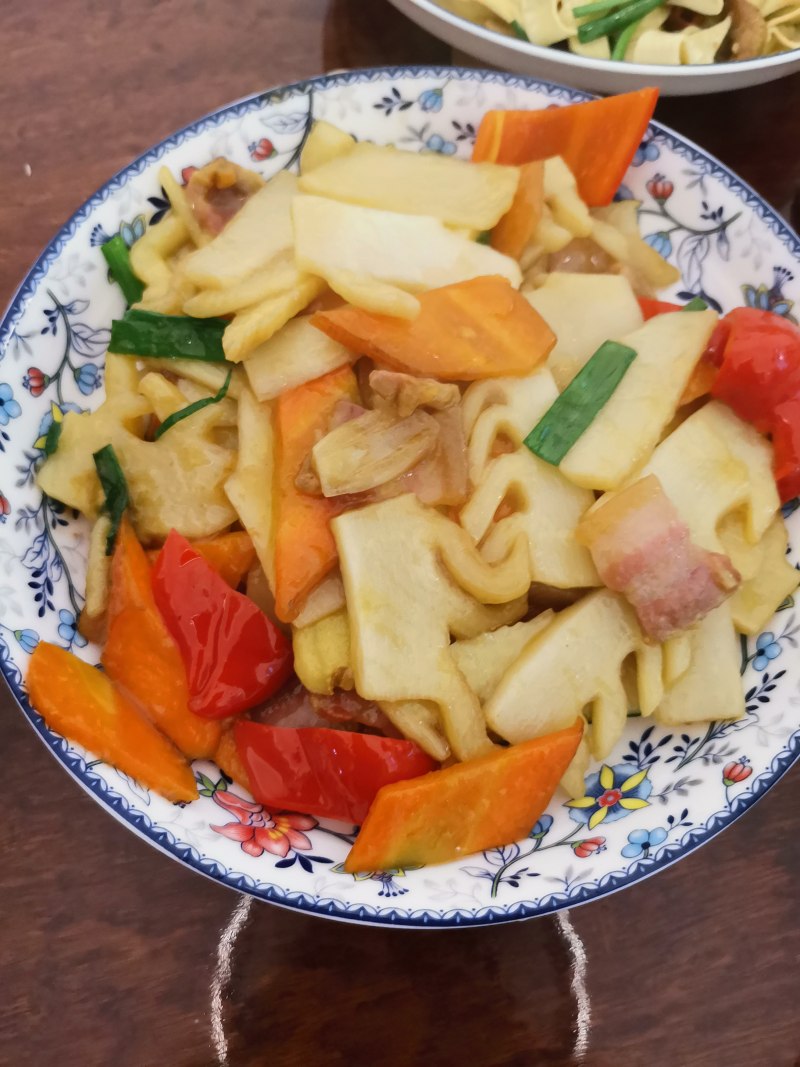 春笋适量;腊肉适量;胡萝卜适量;红椒适量;