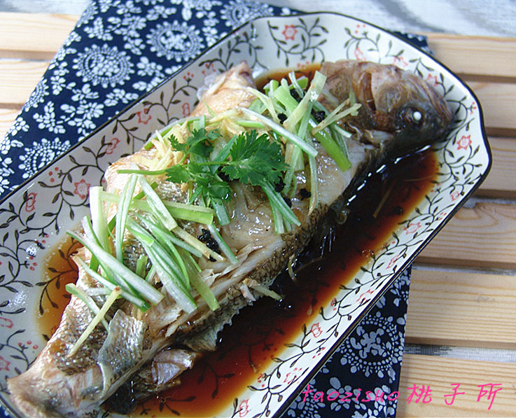 4:蒸好的鲈鱼另入盘,码放上葱姜丝,淋上蒸鱼豉油;