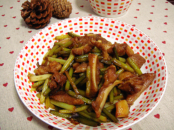 10:炒至蒜薹呈透明状时,放入之前炒好的猪软骨。