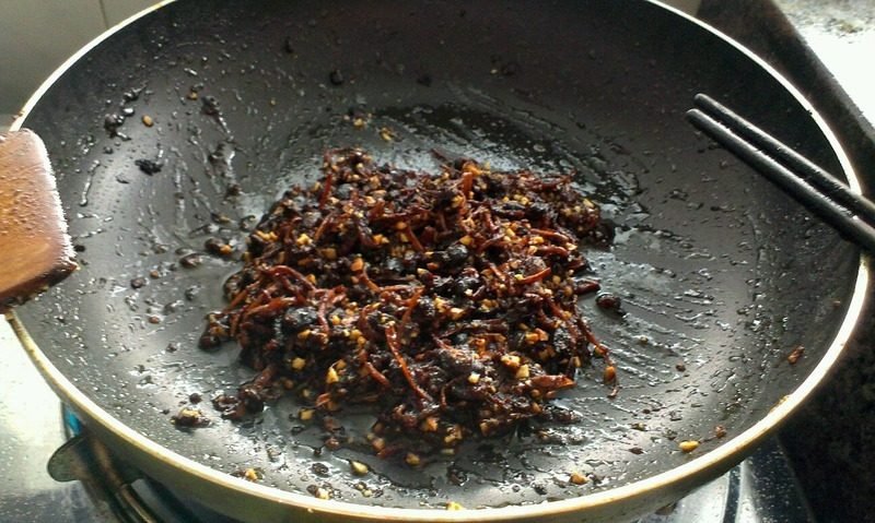 4:热锅放油加热,放入姜、蒜蓉和豆豉炒香,再加入适量的酱油、白糖、水和香菇根,煮沸后放小半勺醋,慢火煮(喜欢食甜味的可以多放白糖,盐可以不放,酱油和豆豉都是咸的,根据个人喜欢调味)。