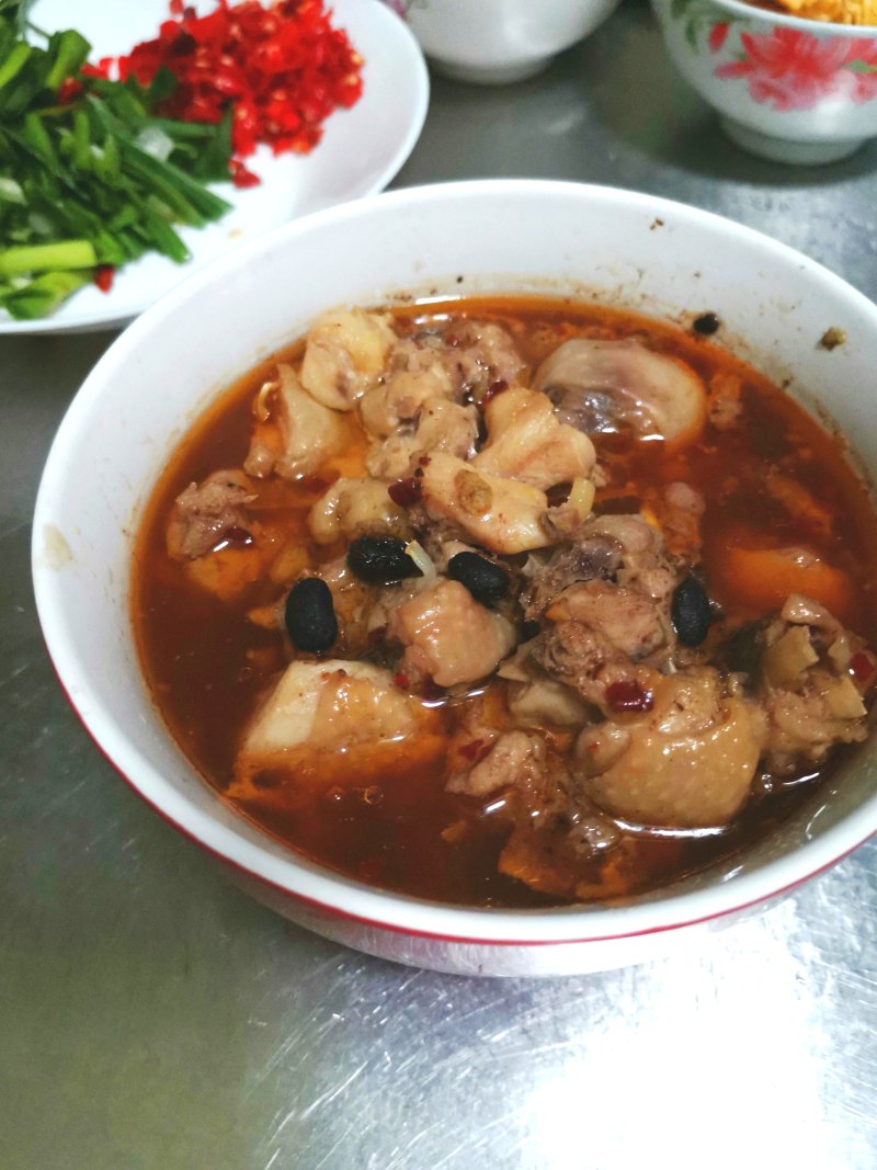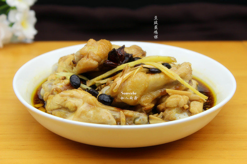 4:腌制好的鸡根上面放生姜丝、豆豉、八角;