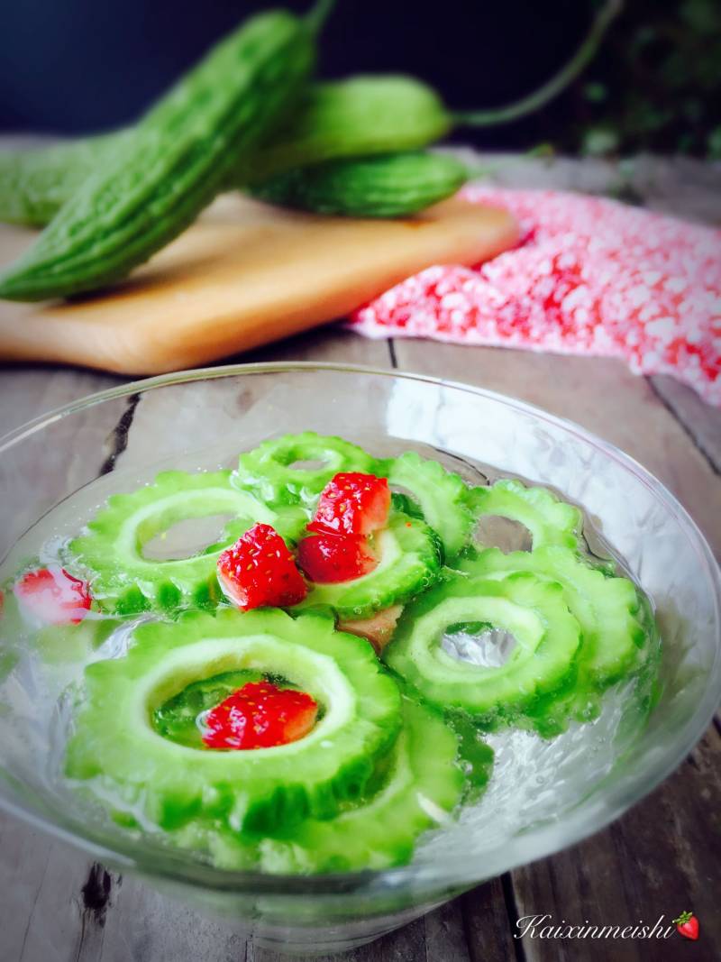 5:倒入雪碧没过苦瓜片即可,切适量草莓丁装饰,也可以用泡好的枸杞装饰。