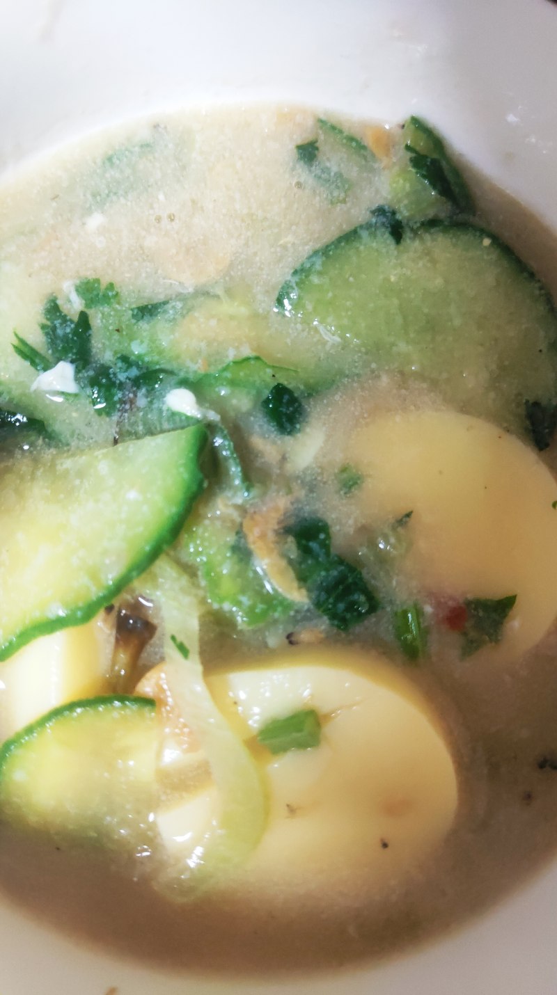 2:虾皮炒出金黄色,加酱油,大葱,煸炒,葱炒软加入清水,加盐,鸡蛋豆腐,家里还有两个大虾我就顺手放锅里,没有可以不用放。水开加黄瓜,再次水开加打散鸡蛋出蛋花,再次水开够钱,放香菜。