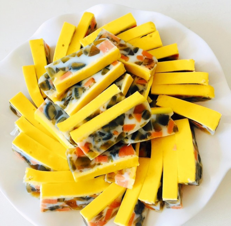 1:火腿,皮蛋切碎,3个鸡蛋,蛋清蛋黄分离,鲜姜一小块磨成末加一小勺淀粉,半小勺盐,一点点水(一个蛋清的量)纱布或者细漏勺过滤到蛋清中,剩一点点放到蛋黄中,蛋清与火腿皮蛋混合放到一个方形盘子里,没过皮蛋,别的形状也可以,最好下面铺一层保鲜膜好脱模。凉水上锅中小火蒸,也不要太小,大概十几分钟的样子,(锅的大小及装水量不一样,中途可以打开看一下,表面稍微发白不流动就可以了,也可用筷子轻戳一下)。