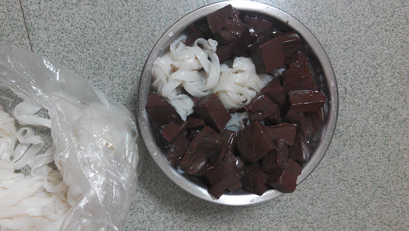 7:把煮好的猪血汤倒入河粉中就可以开吃啦,伴一伴河粉把汤味都吸收就很美味了。喜欢吃重口味的,辣椒生抽,任何喜欢的调味料都可以加。