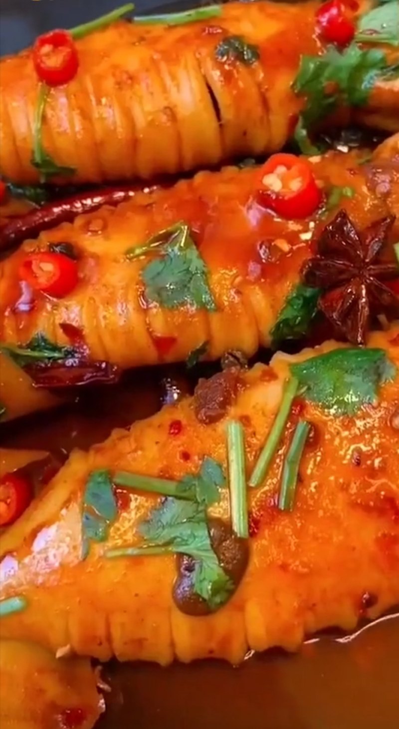 9:汤汁收干出锅,撒上香菜、小米辣装盘。