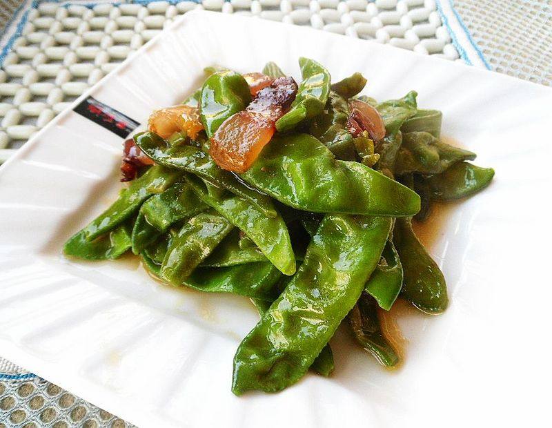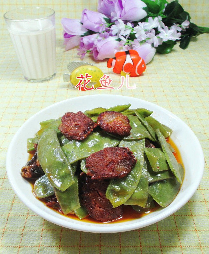 10:腊肠炒熟后倒入甜豆。中大火加盐翻炒。