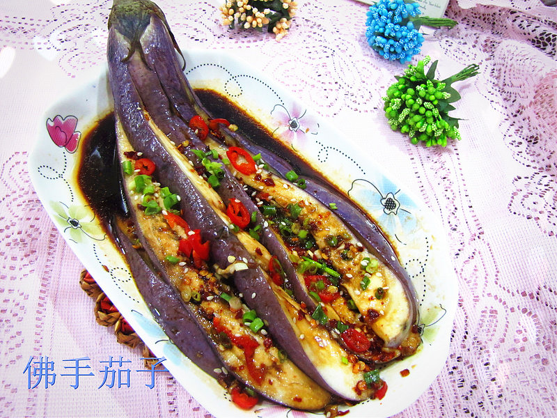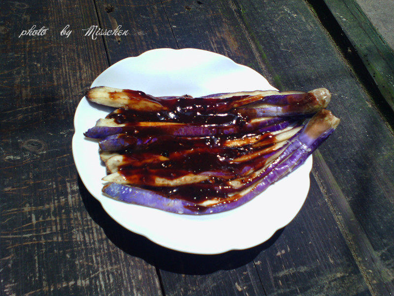 5:把茄子放入盘里,隔水入锅蒸。蒸至茄子软熟为止。
