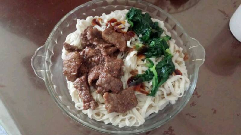 3:另起锅放入沙茶酱,牛肉片微炒,另起锅煮面条,面条煮好后放入碗中,上面盛上牛肉、放上点熟的疏菜,淋上沙茶汁及油膏即可成品。