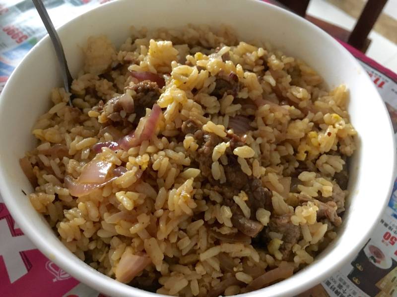 3:先炒洋葱,炒有变色就加入腌制好的牛肉