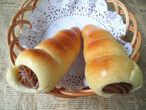12:表面刷上蛋液,烤箱180度预热,中层烤约15分钟至表面金黄色即可,面包冷却,拨去螺旋管,装入裱花袋中的可可卡仕达酱,最后挤在面包里即可