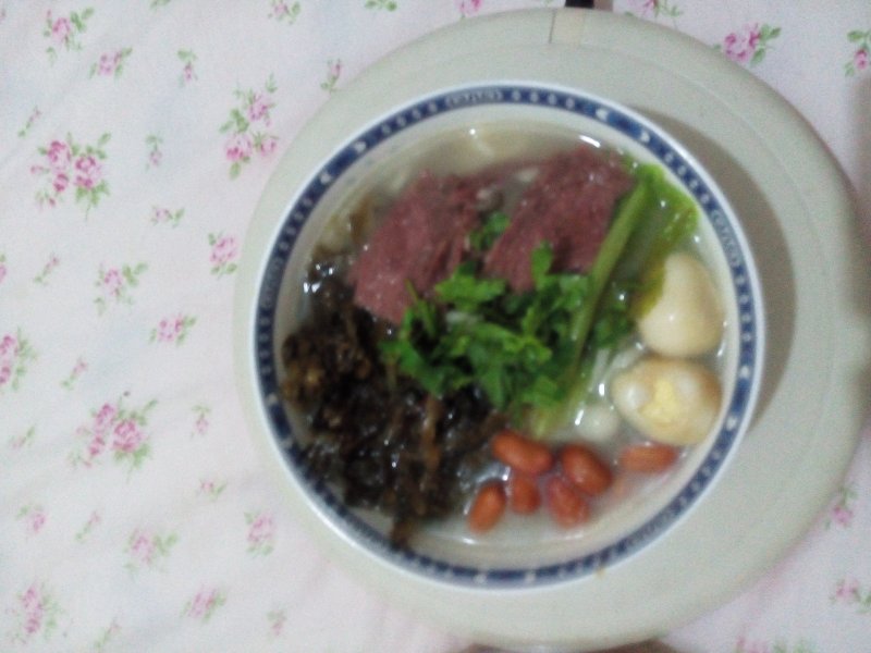 5:把面还有汤汁捞入碗后,就可以码菜了,放上几片牛肉,两个鹌鹑蛋,几粒油炸花生豆,少许香菜。就可以开动了