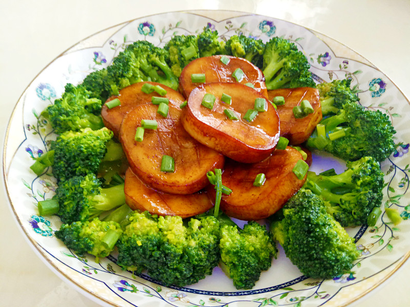 8:将煮好的西兰花在碟子的外围摆好,中间倒入杏鲍菇,撒上葱花即可。