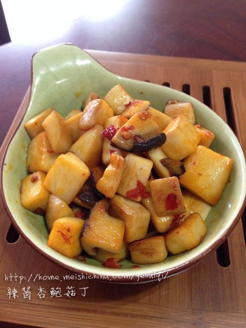 4:把杏鲍菇丁煎至微黄,调入辣酱。