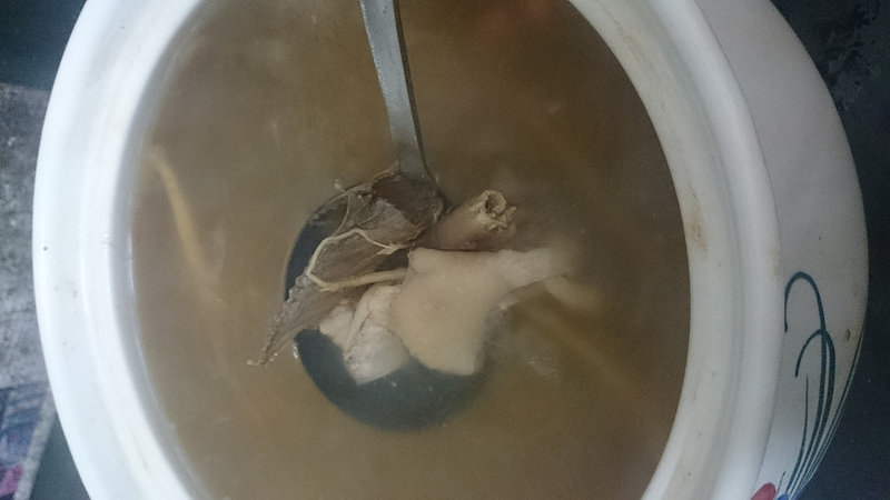 6:把鸡肉海蛇干放入炖锅中,加入泡好的配料,加入姜,及少量的酒。先大火炖开,为保证汤的清澈,烧开时用勺子捞出些漂浮的浑浊泡